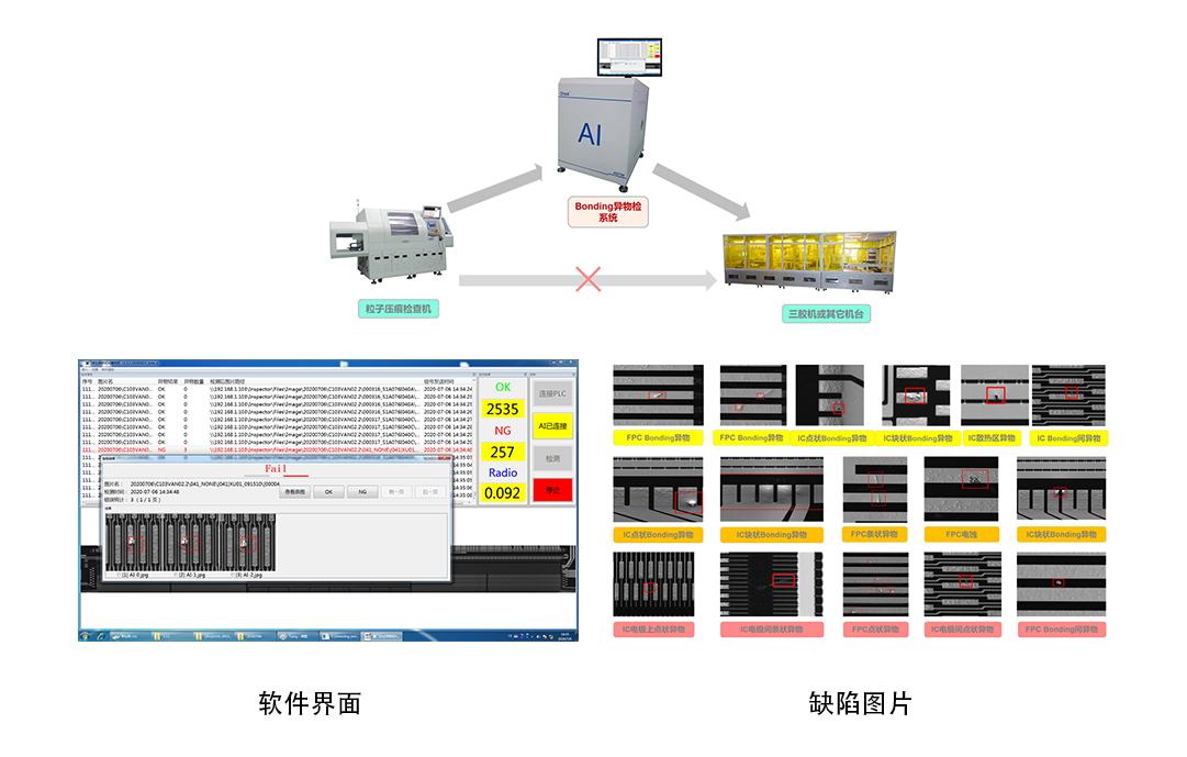 The bonding foreign object detection system is used to detect foreign objects in the pictures of friendly particle indentation inspection machines. Due to the inability of particle indentation inspection machines to detect defects such as scratches, foreign objects, and fragments, it may miss detection. Our bonding foreign object detection system can detect the above defects and improve the yield rate of the production line.